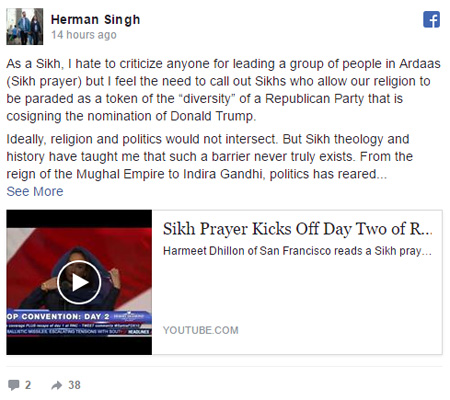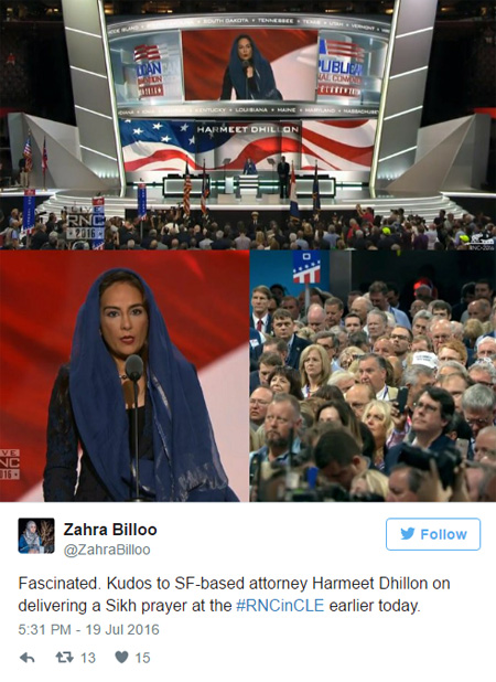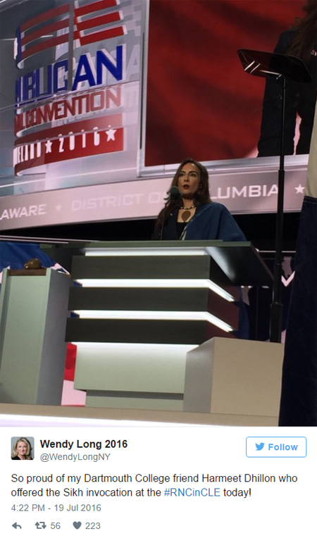 Taking the stage just minutes before Senator Jeff Sessions from Alabama officially nominated Donald Trump as party's candidate for president, Ms Dhillon, delivered the 'Ardaas' in Punjabi and then explained its meaning to the attending delegates.