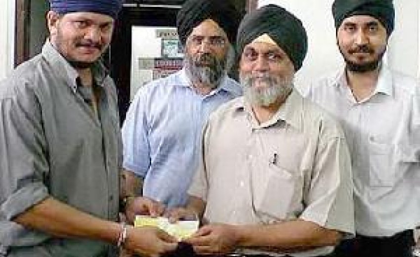 (Photo left: Chipping in: Malkith Singh handing over the cheque to Sarban Singh (left). Also present were SNSM members Jai Nanak Singh (right) and Sukhbeer Singh.)