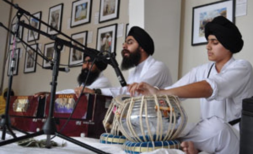 David Wong/Daily Journal - Bhai Tajwinder Singh's Kirtan Jatha performs at a mid-day Gurbani Kirtan, a call-and-response chanting of writings by the Sikh Gurus.