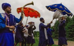 There was a panj carrying swords, another panj carrying nishans (flags), chour seva and umbrellas over both Granths, a trumpet, a drum, a bell, flowers, sprinkled water. The minimum for the procession was 18 to 21 sevadars plus the sangat.