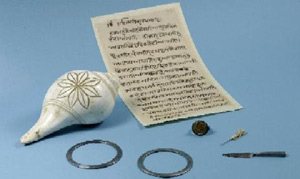 His personal possessions housed at the British Library were confiscated from him at the time of his arrest. They provide are a remarkable insight into this extraordinary Sikh leader. The pair of plain steel bracelets (kara) and the miniature dagger (dastar vali kirpan) are extremely intimate and personal items. Seemingly more mundane yet indispensable for a roving warrior is a humble sewing needle and thread. The conch shell speaks of his role as a spiritual leader. The only obvious symbol of majesty is the seal ring, inscribed in reverse Gurmukhi script with the invocation: "Akal sahai Maharaj Singh ji" literally The Immortal One protects: Maharaj Singh ji.