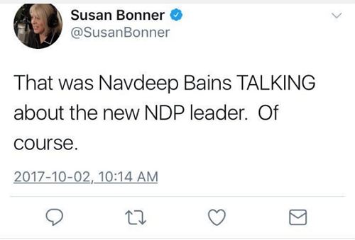 But the celebration was short-lived when today, a political journalist for Canada's national broadcaster reminded us POC that to some white folks, we are all the same. This morning, Susan Bonner, host of CBC radio's The World at Six, tweeted "Canada's newest federal party leader scrums in Ottawa. That's @chrishallcbc 's head. He's co-hosting our special GG coverage" along with a photo of Navdeep Bains, Canada's minister for Innovation, Science and Economic Development. Singh was nowhere to be seen. When people pointed out that Bains is not Singh, Bonner responded by tweeting, "that was Navdeep Bains TALKING about the new NDP leader. Of course."