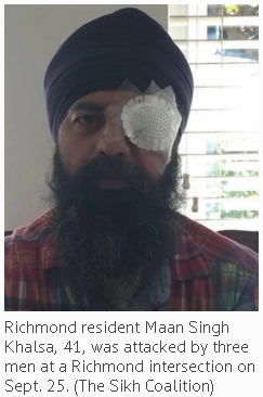 According to the Sikh Coalition, 41-year-old Maan Singh Khalsa was driving home from work at 9 p.m. on Sept. 25 when he was stopped at a red light near Hilltop Mall Drive in Richmond, half a mile from his home.