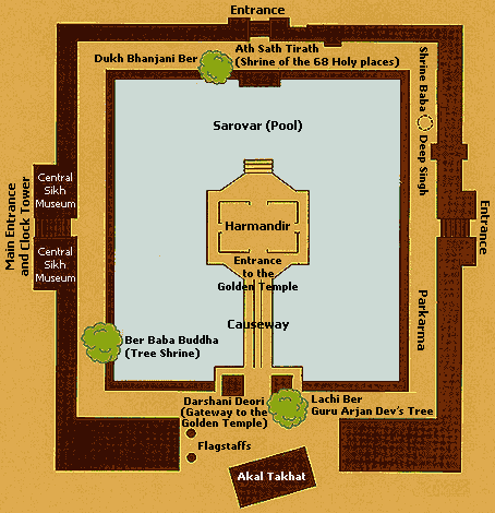 The main structure rises from the centre of the sacred pool, 150 metres square, approached by a causeway about 60 metres long. An archway on the western side of the pool opens on to the causeway, bordered with balustrades of fretted marble, and, at close intervals, there are standard lamps, their great lanterns set upon marble columns. The 52-metre square-based Hari Mandir, to which the causeway leads, stands on a 20-metre square platform.
