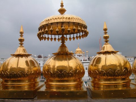 The typical art and architectural features of the Golden Temple can be summed up as (1) multiplicity of chhatris which ornament the parapets, angles at every prominence or projection; (2) the invariable use of fluted domes covered with gilded copper; (3) balconised windows thrown out on carved brackets or bay-windows with shallow elliptical cornices; and (4) enrichment of walls, arches and ceilings by various forms of mural art.