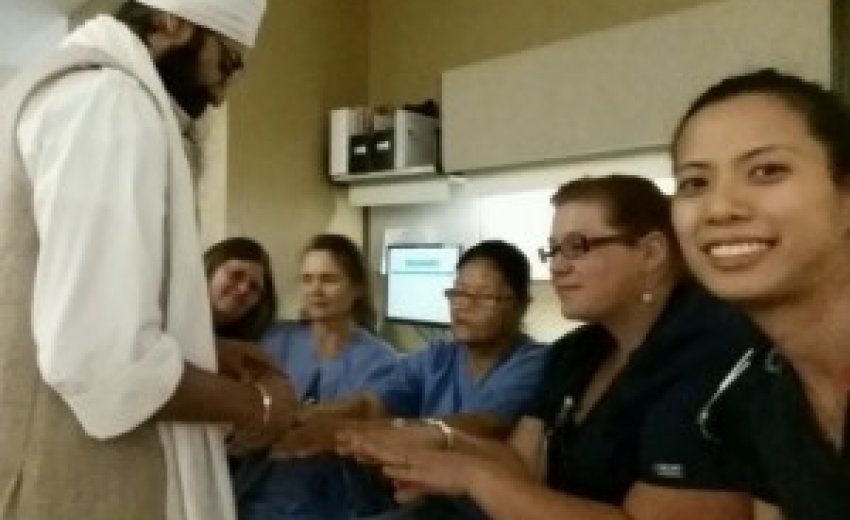 Blessings of the Hands at the hospital. SS Amar Atma Singh offered a Gurbani Tuk and translated it for them as they received the blessing. |