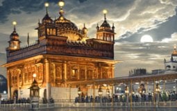Bhagat Singh's spiritual painting depicts the radiant Golden Temple in Amritsar, Punjab, under the bright full moon and cool night sky. Amongst the hustle and bustle of the impatient crowd, there is one sikh who sits apart, in eternal patience.