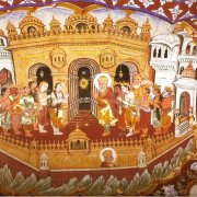 In a similar vein, some old artistic renderings show Guru Nanak wearing a robe inscribed with Koranic verses in Arabic on one half and Hindu shlokas in Sanskrit on the other. Neither detracts from Nanak’s message. In fact, in the presence of both, side-by-side, one can see the centrality and triumph of his teachings. It is like the fresco of God’s hand emerging from the heavens on the ceiling of the Sistine Chapel, or the portraits of God, with Jesus sitting at his right hand. Much of the art that represents the many faiths of mankind, including Sikh art, takes its life from accounts that are hagiographic at best. Even art that seems to distort history or misinterpret the message of the subject can acquire meaning and significance if we look at such artistic depictions not as history or religion, but as supreme compliments to these men of God.