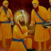 'Guru Gobind Singh, the Tenth Guru, son of Guru Tegh Bahadur gave khande da pahul to five Sikhs on the the day of Vaisakhi Samwat Seventeen hundred fifty five and called them SINGH. First Daya Ram Sopti Khatri of Lahore stood up, followed by Mohkam Chand Chheepa of dwarka, Sahib Chand Nayee of Bidar (Zafrabad), Dharm Chand Jwanda Jat of Hastinapur, Himmat Chand Jheewar of Jagan Nath turn by turn.