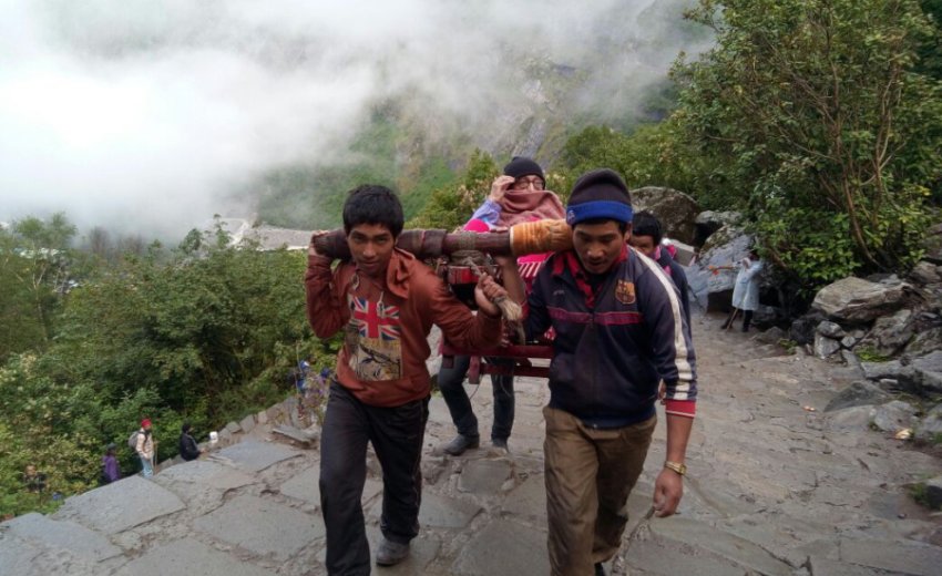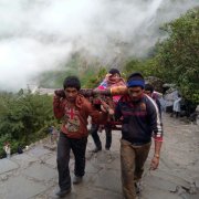He kept a steady pace down, down, down the steep path, for hours. The rain never let up as he descended forever downward like a mountain goat. I was still weepy at the beginning of our trek, then I tried to relax and sleep. I drifted off for a time but eventually found myself awake and nauseous. This time it was motion sickness, the feeling that any minute I was going to vomit inside my basket. I peeked out from under the tarp and saw an older American woman who was traveling in our yatra. She was with a local guide who was assisting her on her hike down the mountain path. I called out to her for help.