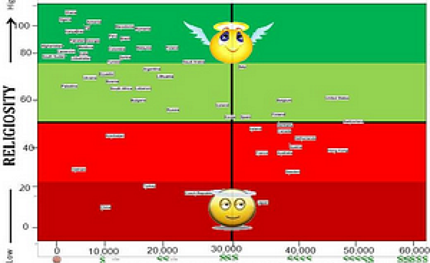 In a study entitled “Global Index of Religion and Atheism” — a survey of over 50,000 respondents in 57 countries conducted in 2012 — WIN-Gallup International researchers showed a negative correlation between “religiosity” and per capita income based on responses to the question: “Irrespective of whether you attend a place of worship or not, would you say you are a religious person, not a religious persons or a convinced atheist?”