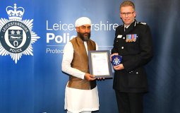 The Leicestershire police have honoured an Indian citizen who saved the life of Namdhari Sikh leader when the latter was attacked in a local gurdwara during his visit here in 2013.