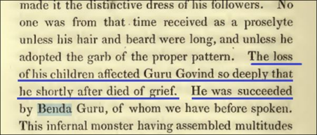 Sayid Ghullam Hussain once again errs when explaining the circumstances surrounding Guru Gobind Singh’s death. He claims that the Guru died from overwhelming grief and despair following the loss of his family. This assertion is not supported by contemporary