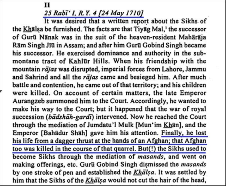 Siyar-ul-Mukhaein can once again be falsified by examining a Mughal contemporary report from the court of Bahadur Shah concerning the death of Guru Gobind Singh. This Mughal court account directly contradicts the claims advanced in Siyar-ul-Mukhaein, thereby further exposing the work’s reliance on conjecture rather than contemporary evidence.