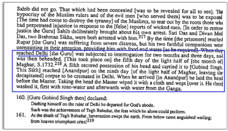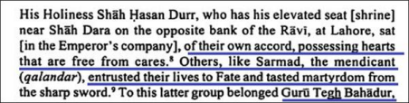 that itself carries moral and spiritual legitimacy. Significantly, he associates the Guru with the fakir Sarmad, who was likewise executed by Aurangzeb for similar theological reasons. This parallel further reinforces the conclusion that the Guru’s execution stemmed from religious and ideological opposition, not from any alleged criminal conduct.