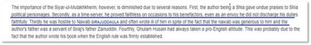 Moreover, Sayid Ghullam Hussain demonstrates a broader pattern of personal and ideological bias in his writings. One notable example is his hostile depiction of Nawab Sirajuddaulah, despite evidence that the Nawab had treated him with considerable favor. This tendency to distort the reputations of individuals based on personal or sectarian predispositions further undermines the credibility of his historical assessments.