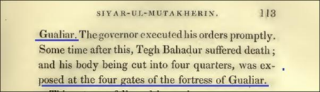 Once again, Sayyid Ghullam Hussain’s narrative collapses under scrutiny. He alleges that the Guru’s body was cut into four pieces and displayed on the gates of Gwalior—a claim entirely unsupported by contemporary evidence and directly contradicted by Sikh and Mughal-era accounts alike. This assertion further illustrates the extent to which his narrative relies on fabrication rather than verifiable historical testimony.