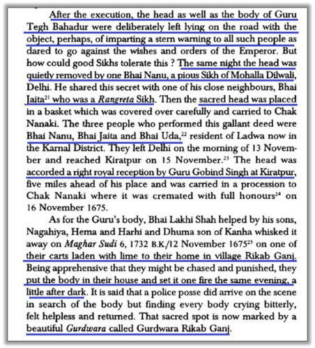 According to Chaupa Singh, following the Guru’s execution, a Sikh named Bhai Jaita courageously retrieved the Guru’s severed head, while other Sikhs disguised themselves and carried away the Guru’s body on a three-wheeled cart to cremate it in secrecy. The site of this cremation is today commemorated by Gurdwara Rakab Ganj Sahib.