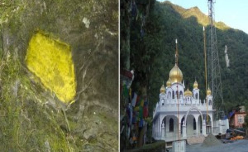 Guru Nanak visited Chungthang after Gurudongmar, Thanggu and Lachen. As he was seated downhill, he was flocked by locals. A demonic-attitude person could not bear people under his influence to go to the guru. In anger he rolled a huge boulder downwards. Guru Nanak stopped the rolling boulder with his stick and to address people climbed up the boulder. Since it had wet earth, his footprints got etched into the boulder. Seeing his miraculous escape more people thronged to him and requested for water and food items. Guru Nanak scratched the earth and a fountain appeared. He spread the rice he had and buried the banana leaves. Later there was rice and bananas all over. He planted the stick which became a magnificent tree. Assam Rifles later camped here and made a Gurdwara in 1970s at the place.