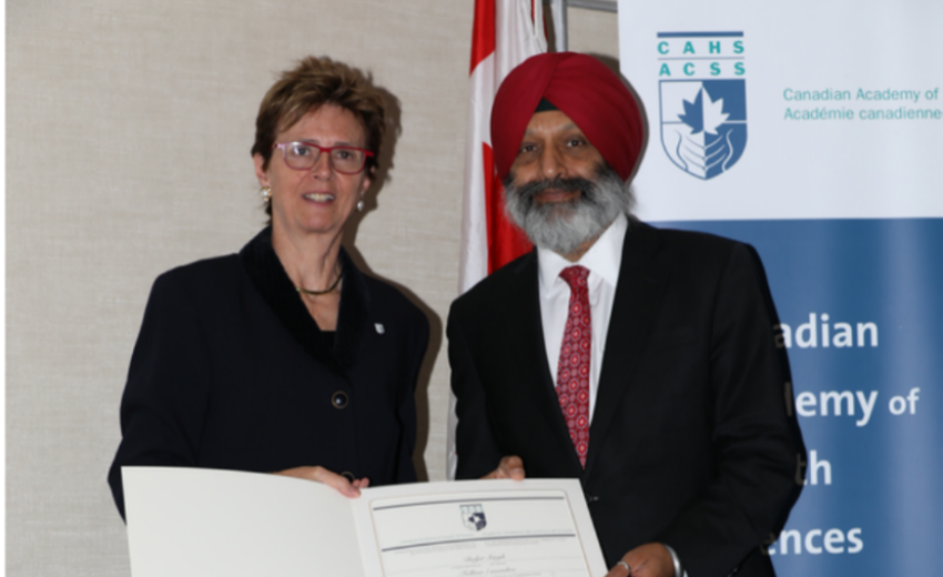 A picture (right) of Dr. Baljit Singh receiving the award/fellowship from Dr. Linda Rabeneck, President of Canadian Academy of Health Sciences.