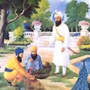 In the first two pictures Guru Nanak is shown under the shade of a tree and peacocks in the background. Even Guru Gobind Singh preferred composing his poetry under a tree as can be seen in the picture on the right.