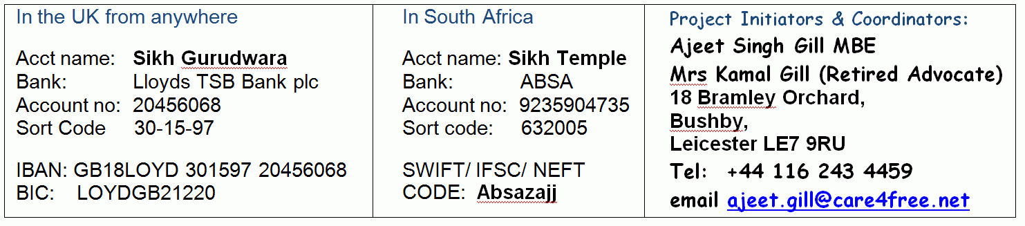 Initially the aim is to start providing food for the local poor people once a week, increasing this service to seven days a week, like at Makindu Temple in Kenya. We intend to extend facilities to provide overnight accommodation for those travelling between Cape Town and Port Elizabeth, irrespective of their caste, colour or creed. Eventually we hope to add a library, religious and educational activities, skills training, and support and help for the needy.