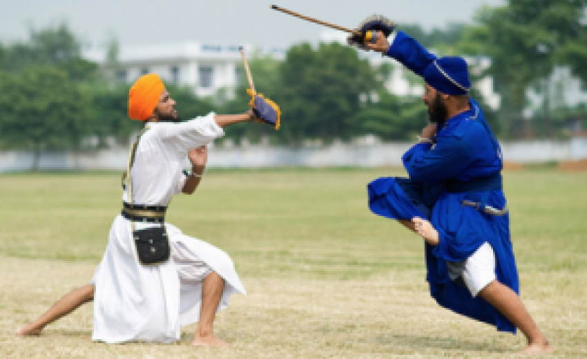 The basic regime for fitness includes a healthy diet and physical exercises such as Sun salutations, Indian press up, and Squats. Gatka is primarily based on number of different paitarās and asanas, which are forms for coordinating the whole body and weapons in unison. The first is the Mūl paitarā which is a simple four-step pattern, and the key to all other forms. The movement requires equal and simultaneous use of both hands and develops ambidexterity. It is a balance and co-ordination exercise and is to be practised repeatedly. Then there are other paitarās based on the tiger, monkey, bull, snake, eagle, etc., that can also incorporate weapons. After the Ardās the warriors bow to the weapons and salute the arms, whilst either approaching the weapons or circumambulating them. Certain mantras are recited from the Dasam Granth Sahib, in particular the Shastra Nām Mālā, Tribhaṅgī Chhaṅd, Bhagautī Astora and Chaṇḍī dī Vār. There are also the war cries like Sat Sirī Akāl and Gurbār Akāl. Before sparring, both players must do the fatehnāmā, or salute each other by ritually crossing and hitting each other’s weapons twice. For more details see my article Kamalroop Singh, ’Sikh Martial Art (Gatka)’ in The Oxford Handbook of Sikh Studies, 2014.