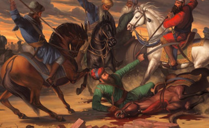 This painting depicts that epic moment when Baba Banda Singh ji Bahadur captures Wazir Singh with a group of Singhs. In order to bring Wazir Khan to justice, Baba ji punishes him for executing the Chotte Sahibzadey, the innocent children of Guru Gobind Singh ji.