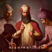 Guru Nanak Dev ji demonstrates that Bhai Lalo ji’s bread, earned through Responsible Actions and Meditation, is dripping with Milk. It nourishes everyone around Bhai Sahib, who bows to the Guru. Whereas the bread of Malik Bhago, earned through irresponsible actions, is dripping with Blood. It sucks the blood of those around Malik Bhago, who is looking shocked by the revelation. Standing behind Guru ji, Bhai Mardana ji watches the miracle in awe.