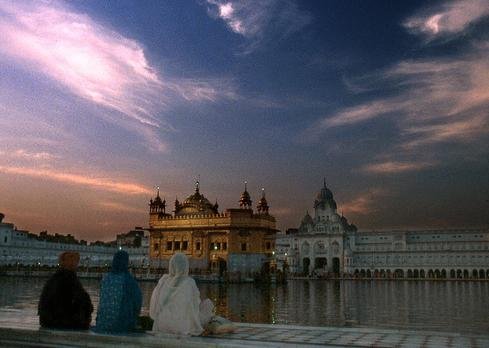 As its gilded domes are bathed in a fiery glow, a lesser radiance catches the eye of many local worshippers—three graceful white-skinned girls, sitting cross-legged, preternaturally erect, clad in blue kurtas and bright white turbans. One, sporting headphones, chants silently to herself. Another caresses a string of beads, while a third flicks her forefingers apart in an arcane scissor-like mudra, an expression of otherworldly bliss on her face.