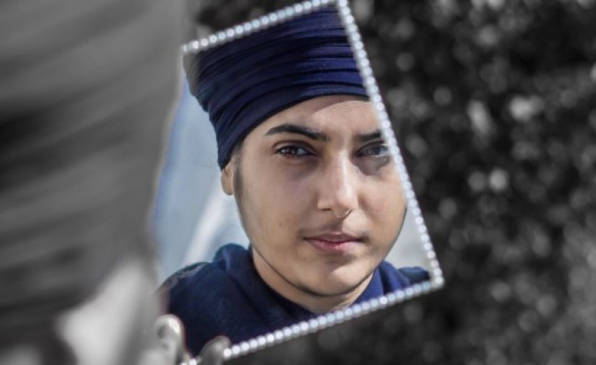 I felt the need to portray my emotions through both pho- tography as well as poetry. The main focus of the picture is on my face and the rest of the photo is blurred, which pro- vides a good depth of field. The mirror in the photo has a pearl border, which represents royalty. Since one of the meanings of Kaur is princess, I tried to demonstrate that through the pearl studded mirror. I am looking at myself in the mirror with intense expressions because I am trying to figure out who I am and where I belong. I wanted to mainly focus on my face and reduce distractions by making the background black and white. Also, I think that I'm not wor- thy of Vaheguru's love and I demonstrated that through the black and white colour. However, my reflection in the mir- ror is like the reflection of my soul and how Vaheguru sees me. One of the interpretations of the colourful reflection can also be that sometimes we make mistakes and believe that we don't deserve Vaheguru's love, but Vaheguru is without hate. Vaheguru loves us without any conditions.