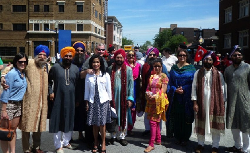 Joining the IPL 500-Festival Parade again this year were representatives of different ethnic and cultural groups as a part of the Nationalities Council of Indiana (NCI) Parade Unit adding to the colorful pageantry and international spirit the Parade. Led by two colorful Chinese Dragons and Lion Dance and the flags of represented nations, the NCI Parade Unit of 200 participants included representatives from China, Ethiopia, India, Japan, Latvia, Liberia, Lithuania, Mexico, Norway, Persian (Iran), Philippines, Poland, Romania, Scotland, South Korea, Sweden, Taiwan, Tibet, Turkey, United States; Native Hawaiians, Sikh Americans, and others in their colorful national and native festive regalia. Ten members (seven men and three ladies) of the central Indiana Sikh American community brought their cultural pride and robust Punjabi-Sikh spirit dressed in brocaded silk kameezes and kurtas (traditional Punjabi outfits), embroidered achkans (long formal celebration outfits), festive chunnies and scarves, and colorful Sikh turbans tied in the traditional and popular styles.