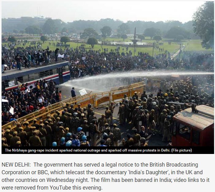 1. Home Ministry sources said the notice, sent by the top officer at the Tihar Jail, alleges that the BBC aired the film without necessary clearrances from the Delhi prison, where filmmaker Leslee Udwin conducted an interview of Mukesh Singh, a man on death row in the 2012 Delhi gang rape case.