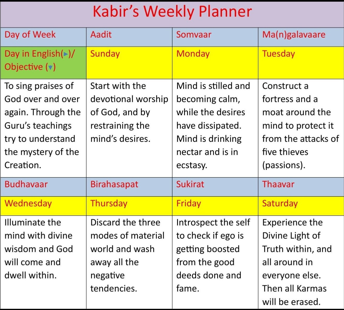 The Daily Planners comprising daily, weekly, monthly, including the Yearly planners have a very recent developmental history from around 1700. But imagine Kabir Ji (1440 – 1518) understood their needs and functionality much earlier, so he wrote a planner with defined objectives. In this bani in Gauri Raag, Kabir Ji has defined crystal clear objectives for each day of the week. So, in his weekly planner we don't see an empty space for each day of the week to add items, to the To Do List as needed. But what we see is a concrete actionable item for each day, which is exquisitely spelled out. These lines are from Page No. 344 of Sri Guru Granth Sahib (SGGS). Let us explore it for our own inspiration.