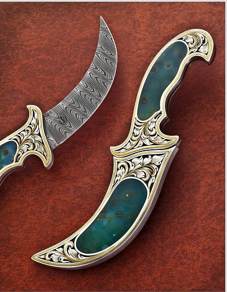 Below is a photo of one of Jot Singh's custom-made Kirpans. It is made of stainless Damascus steel with argentium sterling silver and ocean jasper (mineral from Madagascar) and 24Kt. gold inlay work and engraving. Jot Singh invites everyone to contact him to create something unique and inspired for yourself or your loved ones.He is a true artist and creating beautiful kirpans is his passion.