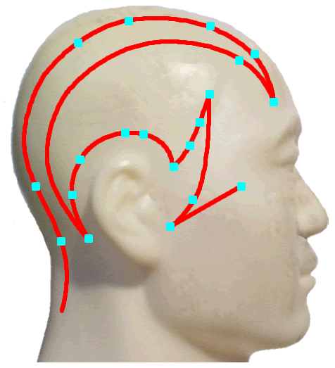 The Gall-bladder meridian starts beside the eye and descends the side of the head and adjacent to the ear and on the face, it descends through the shoulder, passing down the side of the body and legs to the foot and fourth toe.