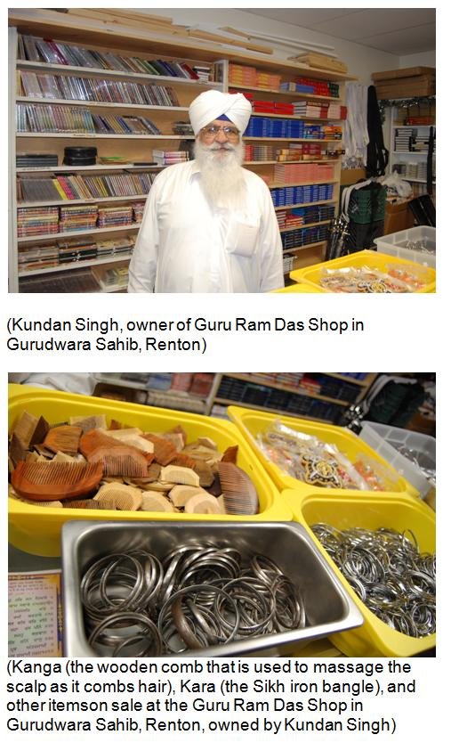 A fairly decent shop is within the walls of Sikh Gurudwara Sahib in Renton. It is run by Kundan Singh. He sells all the needs of the Sikh community including the Kanga (the wooden comb used to massage the scalp as it combs the hair), Kara (the Sikh iron bangle), Kirpan (the Sikh sword), Kachera (the military undergarment). These are part of the 5 K's mandated by Guru Gobind Singh for every Sikh. He also sells, various books, music tapes and disks, turbans, etc. Kundan Singh said that although it is within the Gurudwara Sahib it is not supported by the Gurudwara Management.