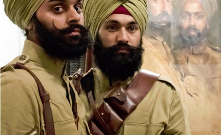 | Sikhs from London recreate the life of Sikh soldiers from the 15th Ludhiana Sikhs (now 2 Sikh) stand beside a 1915 portrait of two cavalry officers by Philip de Laszlo.Photo credit: Verinder Sharma, Kreative Barn |