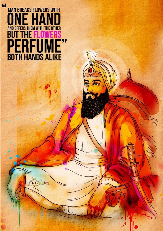 Let me illustrate this state of mind, the power of it with an example from Guru Har Rai ji. The emperor at that time, Shah Jahan, had four sons. One of his sons, Dara Shikoh, became very ill and they couldn’t find the medicine to cure him. At last Shah Jahan contacted Guruji and asked him for help, because Guruji had established a hospital and research centre in Kiratpur Sahib, where he had some rare medicial Herbs he used to treat People with (and even animals!) Shah Jahan had previously discriminated people from other beliefs, including Sikhs. He had ordered to tear down many Gurdwaras and had a lot of wars with Guru Har Rai jis grandfather, Guru Hargobind ji. Guru Har Rai ji was aware of all these facts, yet he instantly agreed to give Shah Jahan the medicine. It’s said that he came with this statement: “Man breaks flowers with one hand and offers them with the other, but the flowers perfume both hands alike”. So no matter if someone does anything ill or good to the flower, the flower will still have the same lovely fragrance. This illustrates that Guru Har Rai ji was in chardikala – his state of mind was in peace and balance. Others actions didn’t disturb his peace of mind. The surroundings had nothing to do with his state of mind.
