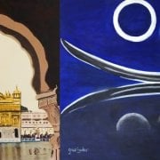 I have painted Harmandir Sahib more than once because whenever I am in Darbar Sahib, I feel enveloped by Guru’s love and chardikala, and all worries and concerns are dissipated. The four doors of the Harmandir Sahib signify that people from all religions and faiths are welcome. This message of universal brotherhood is the cornerstone of Sikh Faith. My mixed media painting of Darbar Sahib is a humble attempt to depict the entrance to our most revered place of worship.