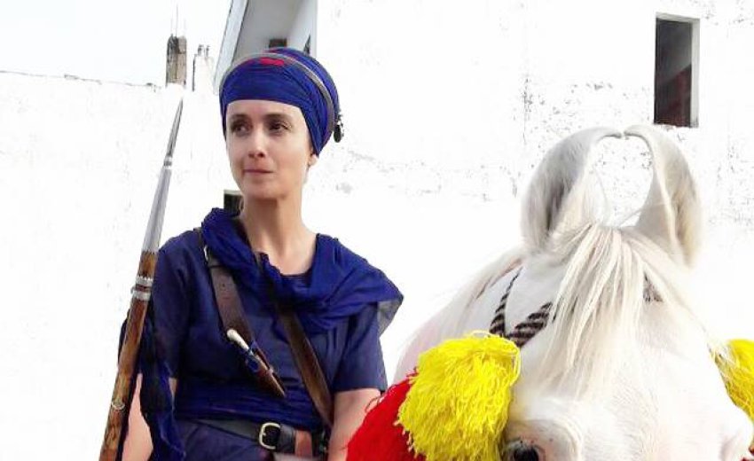 Harsangat Raj Kaur is one of the rarest white Sikhs who has become a Nihang. Legends and histories both attest to the Nihangs' martial prowess. Their austerity and self-discipline is respected. Flaunting their blue flowing robes, sporting large blue turbans surmounted by steel quoits, and displaying their martial skills with swords and on horseback, the Nihangs, an order of Sikh warriors, are famous for their extraordinary victories in historical wars.