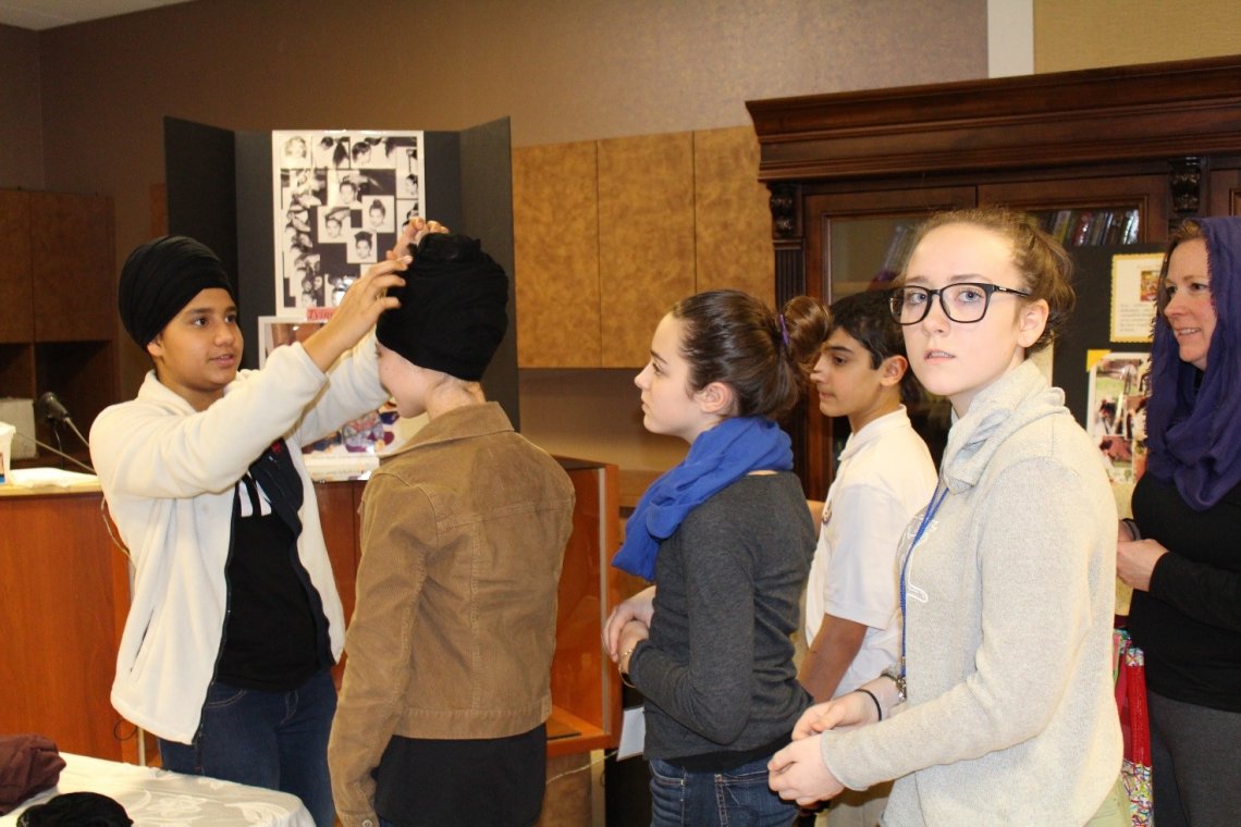 Gurdwaras in Detroit and surrounding areas hosted more than 600 students from 7th grade (axe approximately 14 years) along with their parents to support Religious Diversity Journeys to Sikh Gurdwaras. More than 150 students along with teachers and parents arrived one morning at the Mata Tripta Ji Gurdwara Sahib. After the breakfast, they all were given an overview of Sikhism in the Diwan Hall. After this, students were divided into four groups to attend four breakout sessions of about 35 minutes each. The topics included Dastaar and the 5K’s, Service Project, The Gurdwara and Gatka. During the Dastaar session, turbans were tied as well. An overview of Langar was also presented followed by Langar and question/answer session. Students also learned the importance of service by helping prepare the Langar.