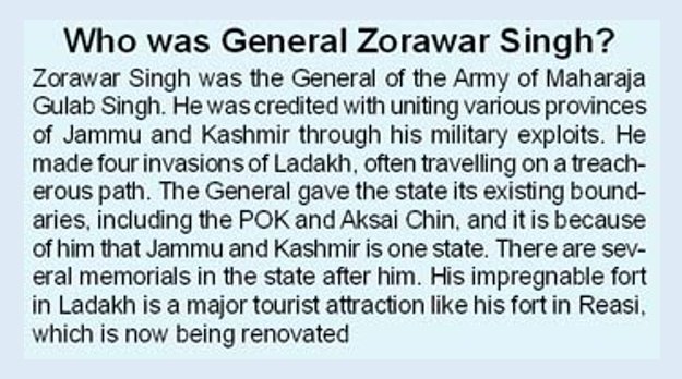 Zorawar Singh is credited with the conquest of Ladakh (now part of Jammu & Kashmir state) in 1834, which was an independent state but culturally part of Tibetan Buddhism and also knows as Little Tibet. He later led a successful campaign against Gilgit-Baltistan (now part of Pakistan administered Kashmir) in 1839/40. However he is mostly remembered for his daring campaign in Tibet in 1841 and enjoys an iconic status among Hindu Dogra community of Jammu region similar to what Hari Singh Nalwa enjoys among Sikhs.