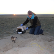 We work with one of the most endangered species in North America, the black footed ferret – there are only 350 left. They rely on prairie dogs, and many agriculturalists feel they are pests since they eat grass for cattle, so they poison them. But the black footed ferrets are important, they are “keystone animals”- they serve a big role in the interconnected system of animals.