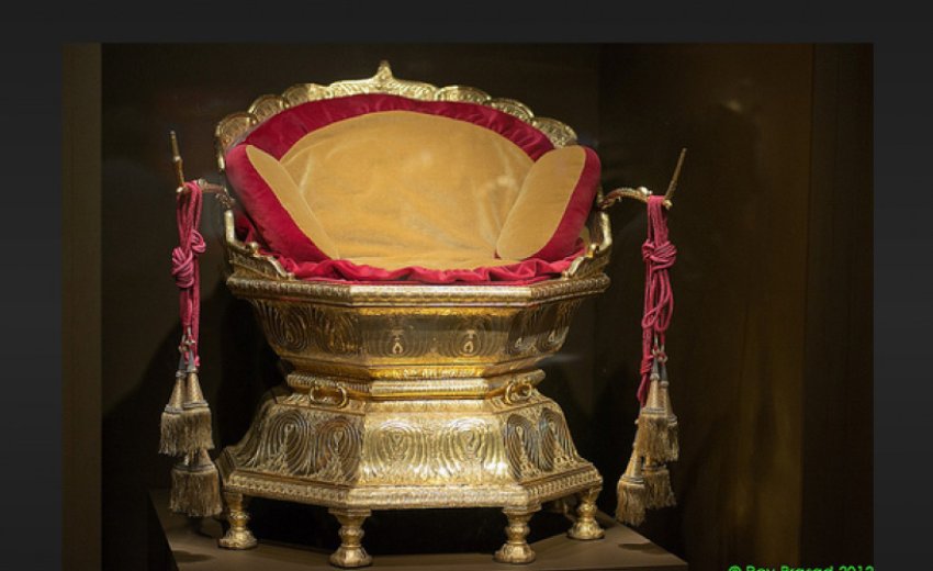 Upon closer inspection, the throne's intricate details become evident. Even for those familiar with it, like the narrator who has seen it numerous times in the museum, the opulence of the work on the back of the throne still strikes a chord, even though it is sadly not very visible in the current display case.