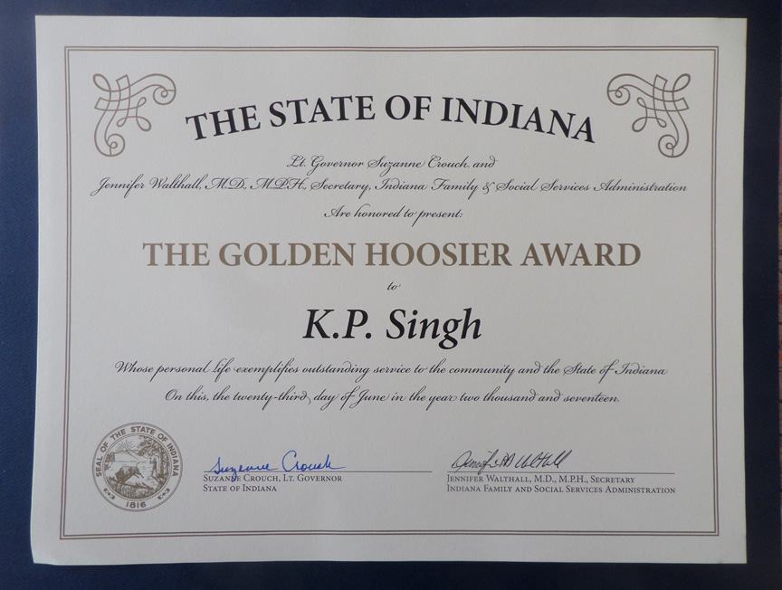 Long time Indiana resident Kanwal Prakash "KP" Singh was among the 22 outstanding Hoosiers who received one of the State of Indiana's highest awards designated for senior citizens who have made significant contributions to the State in different fields and continue to volunteer their gifts and talents, energy and service to worthy causes and community initiatives, institutions and areas of critical need that make a difference to the communities across the State.