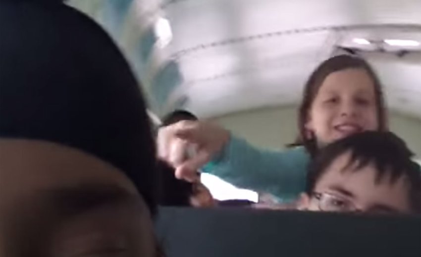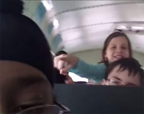He sits facing forward in his bus seat throughout the video, which lasts less than 45 seconds. He simply holds the cellphone up to show his classmates sitting in the rows behind him; he does not himself turn around to face them.