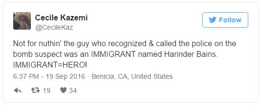"Not for nuthin' the guy who recognized & called the police on the bomb suspect was an IMMIGRANT named Harinder Bains. IMMIGRANT= HERO!" tweeted Cecile Kazemi, echoing a sentiment repeated over and over online.