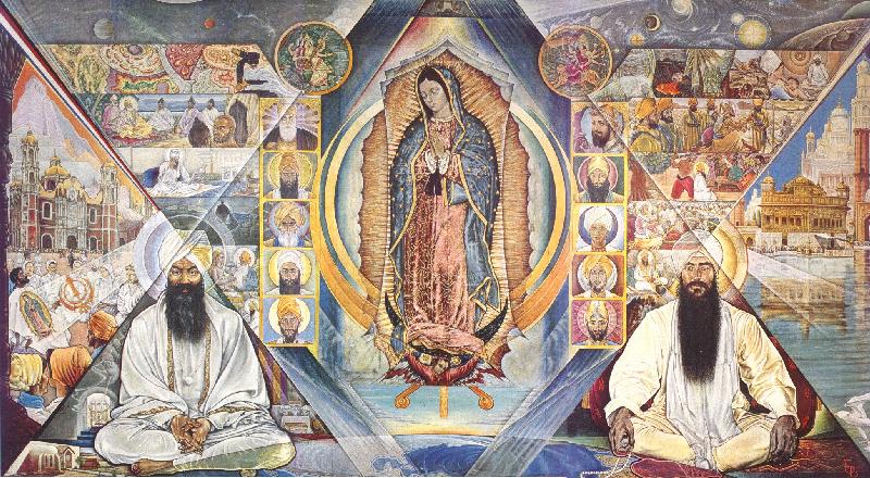 Although Bhajan and 3HO are eschewed by some Sikhs, and sometimes excoriated, Bhajan was a spiritual teacher to his followers. The organisation established its ashram in New Mexico, where a local painter, Ed O'Brien, inspired by the Yogi, painted the following fresco.