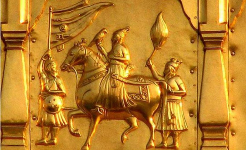 Not finding any sign of Khanda Sahib symbol in any of the HukalNamay, I turned to the thought that may be this was given to Khalsa Panth by Sri Guru Gobind Singh Ji at the time of Vaisakhi 1699, or sometime around then. The search for Sri Gobind Singh Ji’s Nishan Sahib (Flag) was started, I came across many paintings of Sri Guru Gobind Singh Ji with a Nishan Sahib (Flag) as a part of the picture. Most of the time it was a triangular shape with different colors lining around the edges and some design in the middle. In some cases the central part of the triangular Nishan Sahib included the design of Kirpan, a Dhaal, and a Khanger. One such painting / picture is included above the front door of Darbar Sahib (also known as Goldern Temple), Amritsar, Punjab. It is included below.